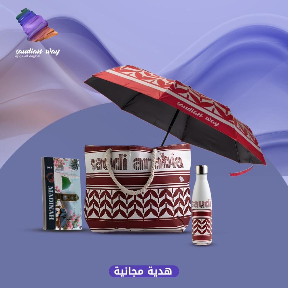 بكج الشماغ يضم مظلة أنيقة وقارورة مياه وحقيبة الشماغ و مغناطيس ثلاجة تصميم المدينة المنورة، كل هذا تحصل عليه بسعر حصري وجودة عالية من خلال متجر الطريقة السعودية.